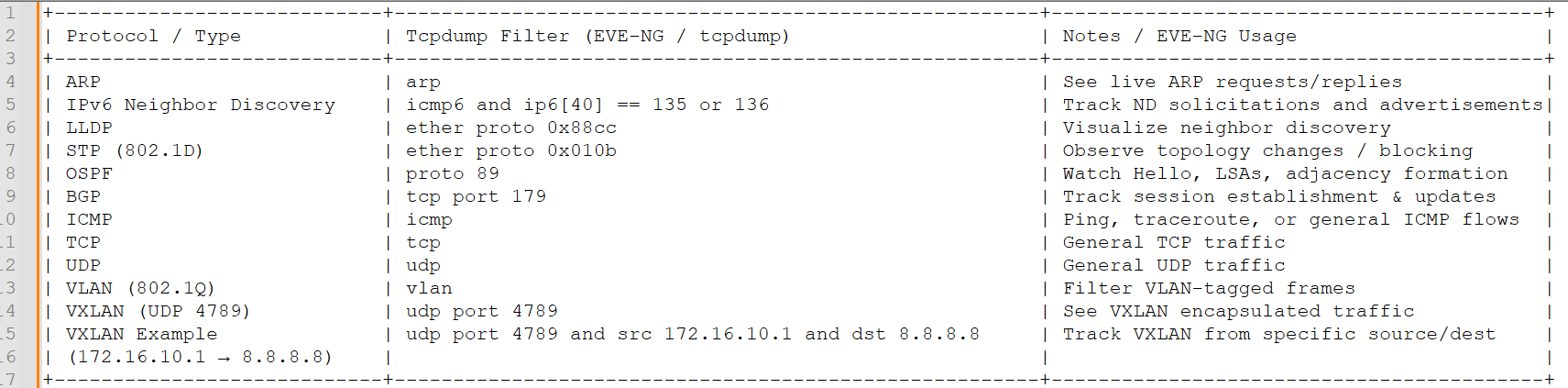 | Protocol / Type | Tcpdump Filter (EVE-NG / tcpdump) | Notes / EVE-NG Usage |